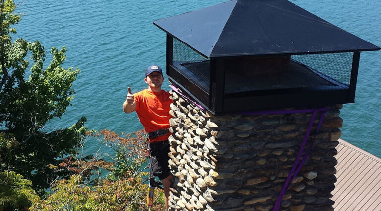 Here is one of our techs installing a large full cap on one of our beautiful local lakes – not a bad view!