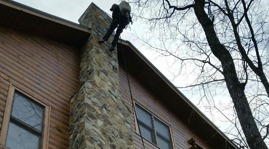One of our techs repelling from a tall chimney and applying a water repellant. This product works incredibly well and will cause water that hits the surface of the chimney to bead and roll off- much like a rain jacket would.