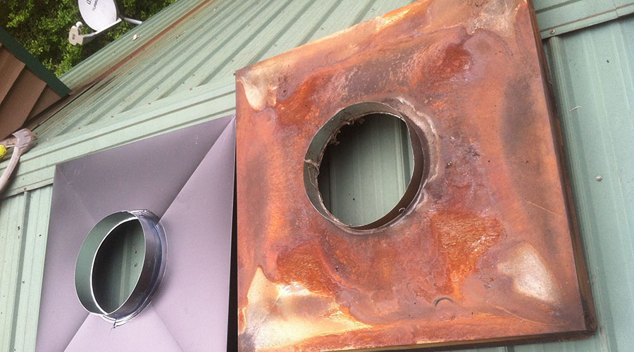Replacing A Chase Cover : Here are two chase covers – the old rusty one, and our new custom powder coated, stainless steel chase cover. This is the part of factory-built fireplace systems that keeps the rain out of the wooden chimney chase. Pretty important!